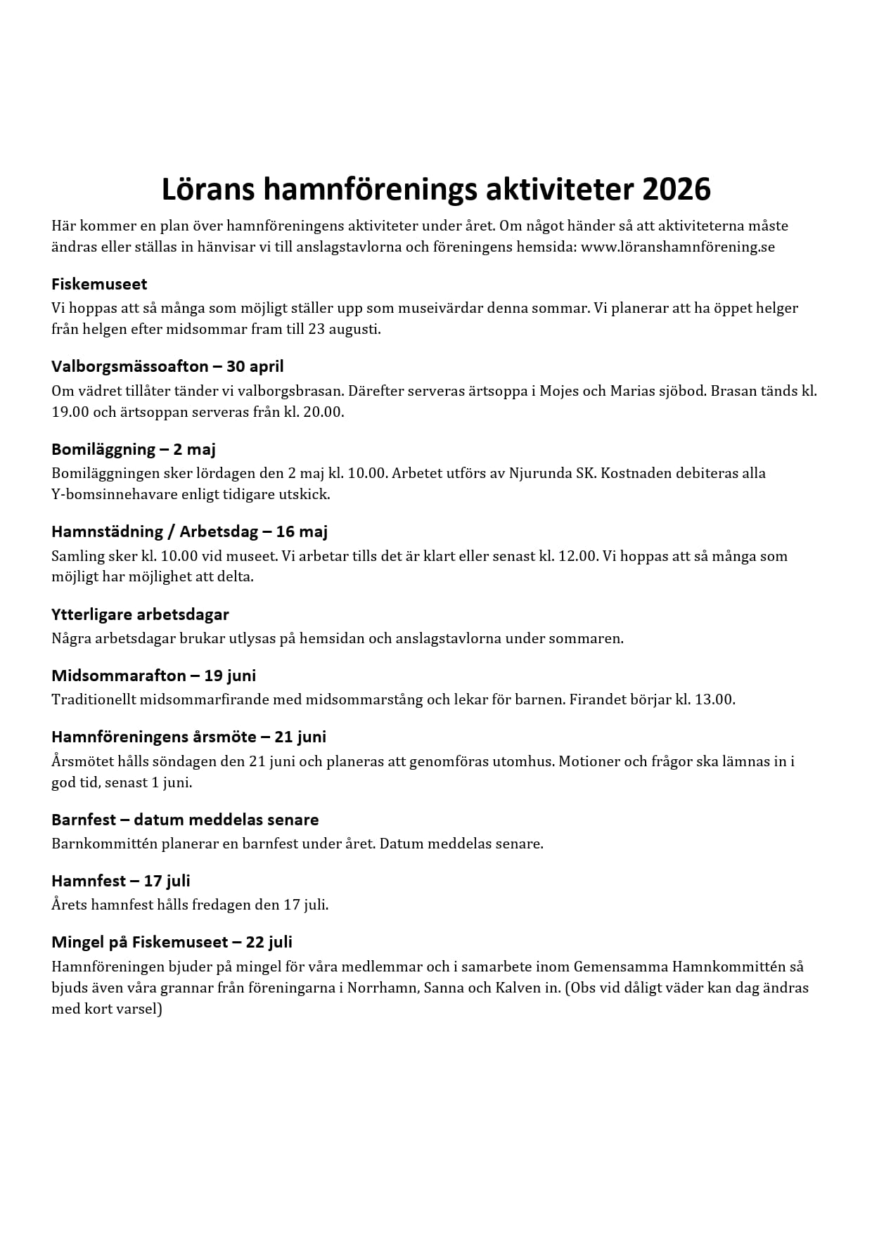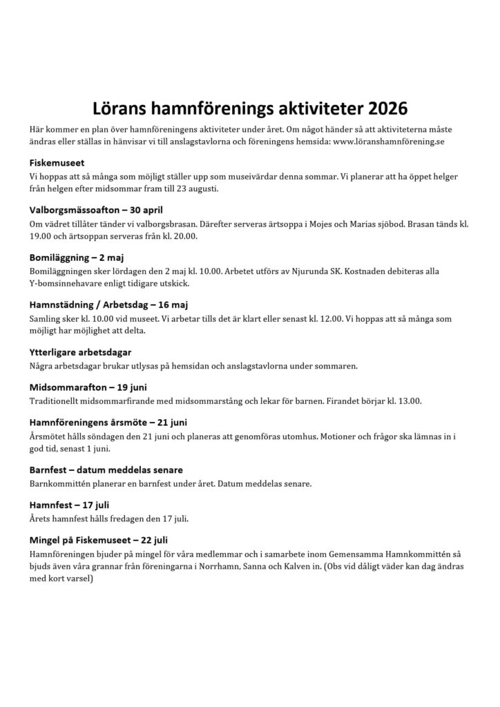 Hamnföreningens aktiviteter 2026